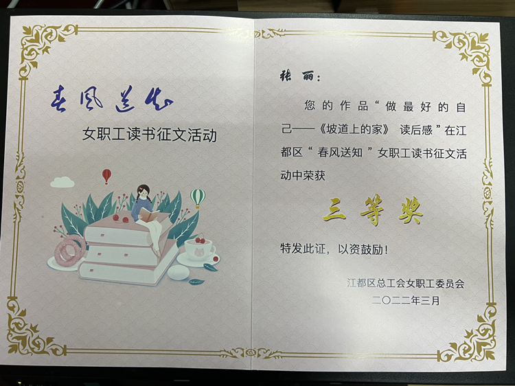 為全面提升員工綜合素質,倡導終身學習理念,豐富精神生活,引領職業(yè)女性愛上閱讀,培養(yǎng)閱讀習慣,在閱讀中獲得幸福感,激勵女職工立足崗位,以最美的奮斗姿態(tài)砥礪前行。為此龍川水務公司除在內部多形式的開展讀書比賽和讀書分享會等相關活動之外,還積極響應上級讀書征文活動號召,鼓勵大家踴躍投稿參賽。日前,在揚州市江都區(qū)總工會開展的“春風送知”女職工讀書征文活動中,由龍川水務公司選送的人力資源部張麗的參賽作品“做最好的自己—《坡道上的家》讀后感”獲得了三等獎。