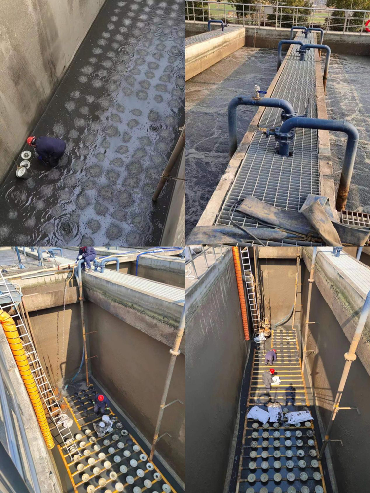 圖為邵伯鎮(zhèn)污水廠曝氣盤維護(hù)換新施工現(xiàn)場(chǎng)。