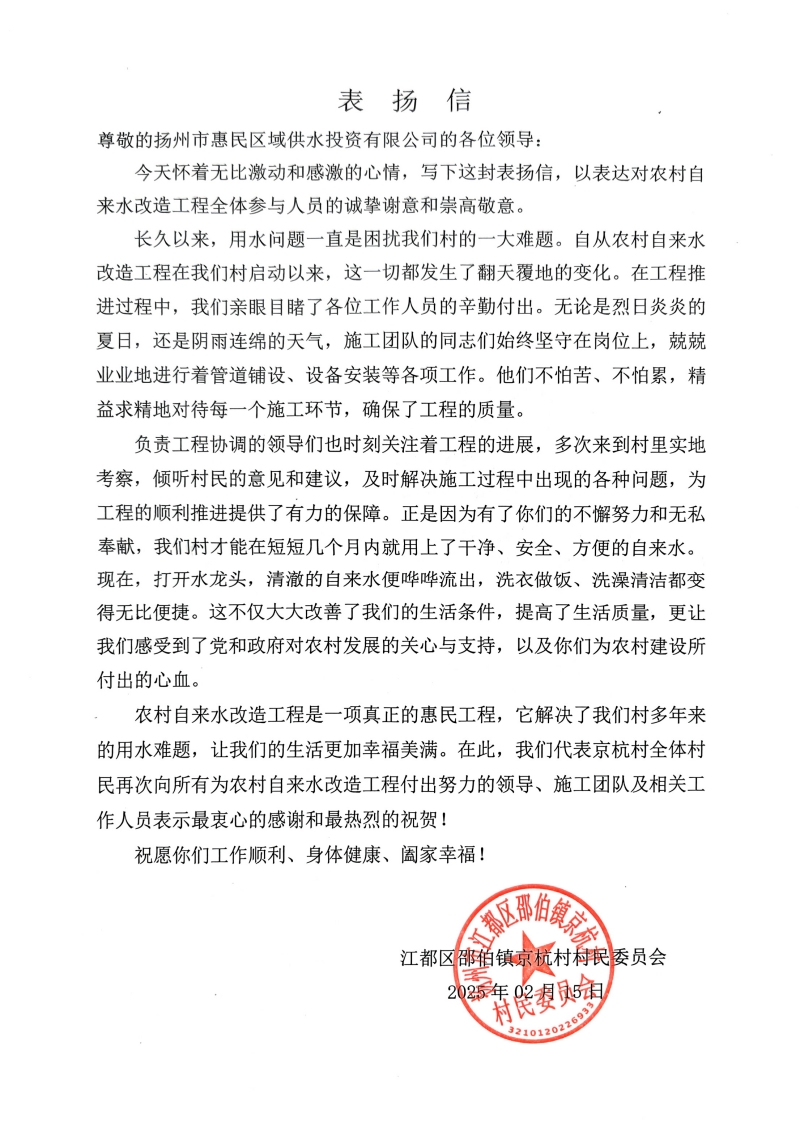 “以前村里因為用水問題,鄰里之間偶爾會鬧矛盾,現在水的問題解決了,大家的關系也更和睦了。”村干部笑著說。村民們自發組織起來,寫了這封表揚信,用最樸素的方式表達感激之情。“這封信雖然寫得簡單,但每一個字都是我們的心里話。貴公司幫我們解決了大難題,我們打心底里感謝!”